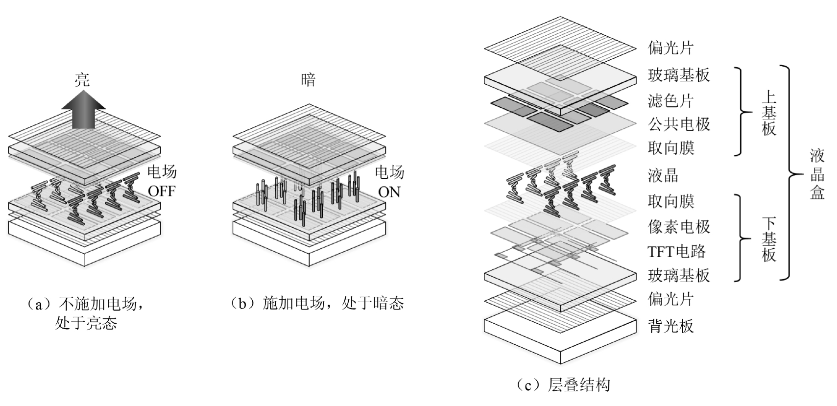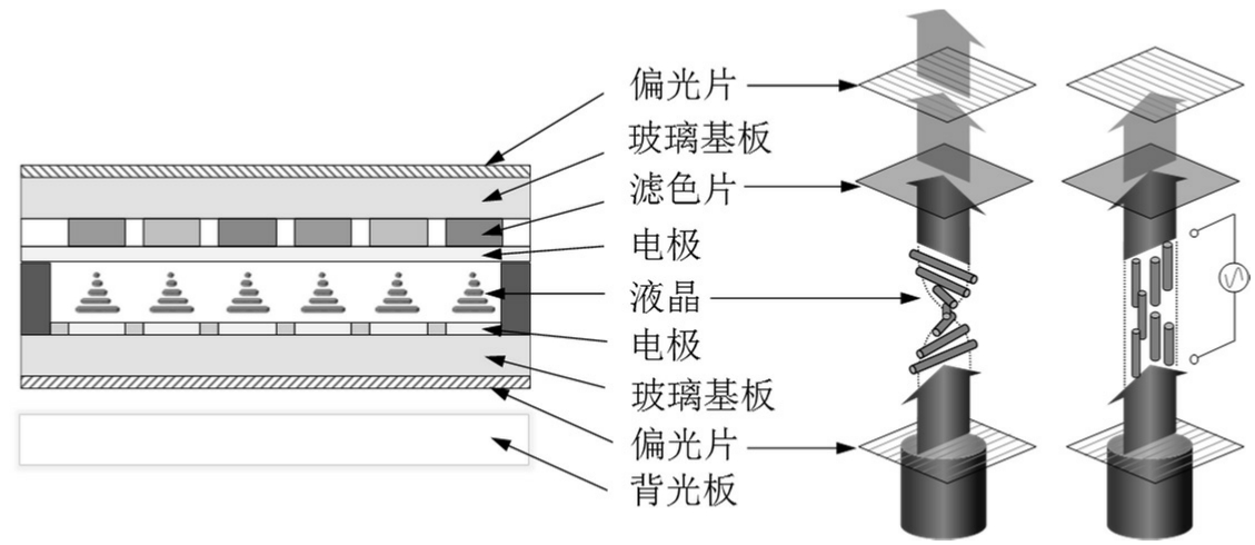 LCD的基本原理是,将液晶置于两块玻璃基板之间,在两块玻璃基板的两个电极的作用下,液晶分子扭曲变形,改变通过液晶盒光束的偏振态,实现对背光源光束的开关控制。若在两块玻璃基板之间加上滤色片,则可实现彩色显示。