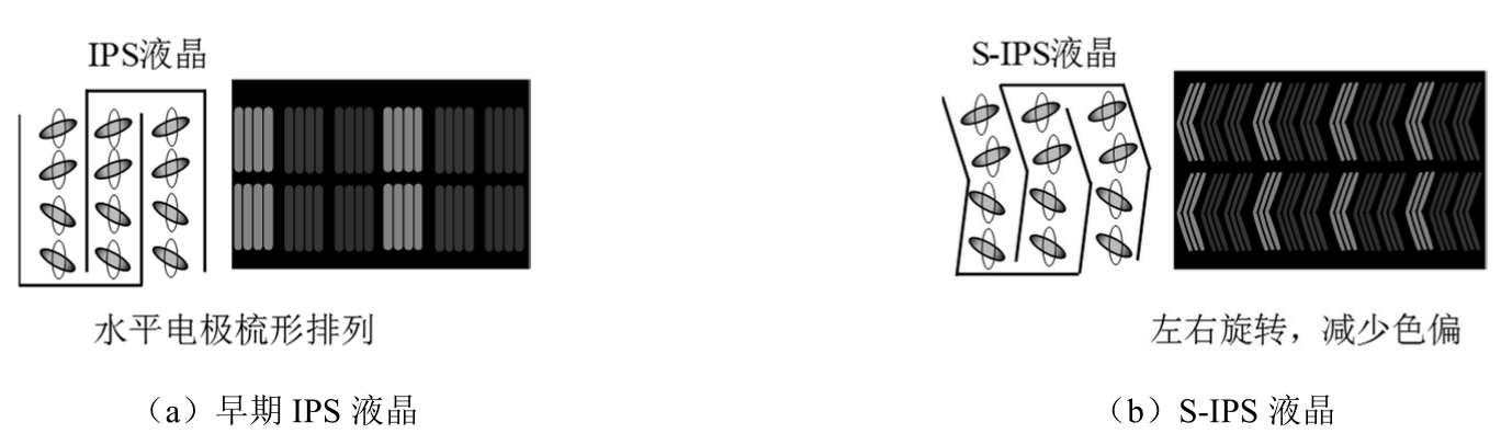 IPS液晶由日本的日立(Hitachi)公司于1996年研发。其特点是液晶分子始终平行于屏幕,能有效控制漏光。经过多年发展,目前显示器用IPS液晶主要由韩国LG公司研发和生产。与图2-30(a)所示的早期IPS液晶相比,S-IPS液晶通过导入人字形电极和双畴模式,改善了特定角度的灰阶逆转现象,并进一步拓宽了视角,实现了S-IPS(Super IPS)178°广视角技术,如图2-30(b)所示。S-IPS液晶不仅在视角广度上达到178°,仰角、俯角的有效收视范围也能达到178°,有效解决了视角范围小、侧面观看略有失真的问题。按照研发的时间线来看,目前IPS液晶包括IPS液晶(日立),DD-IPS液晶(IBM),ACE液晶(三星),S-IPS液晶(LG),E-IPS液晶、H-IPS液晶、P-IPS液晶,AS-IPS液晶,UH-IPS液晶和H2-IPS液晶,AH-IPS液晶,PLS/S-PLS液晶,AD-PLS液晶和AHVA液晶。目前IPS液晶的主要生产厂家有日立、松下、东芝、三菱电机、LG和TOPFOISON等。