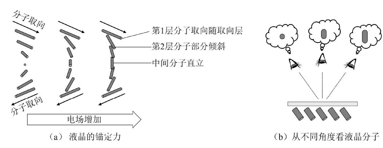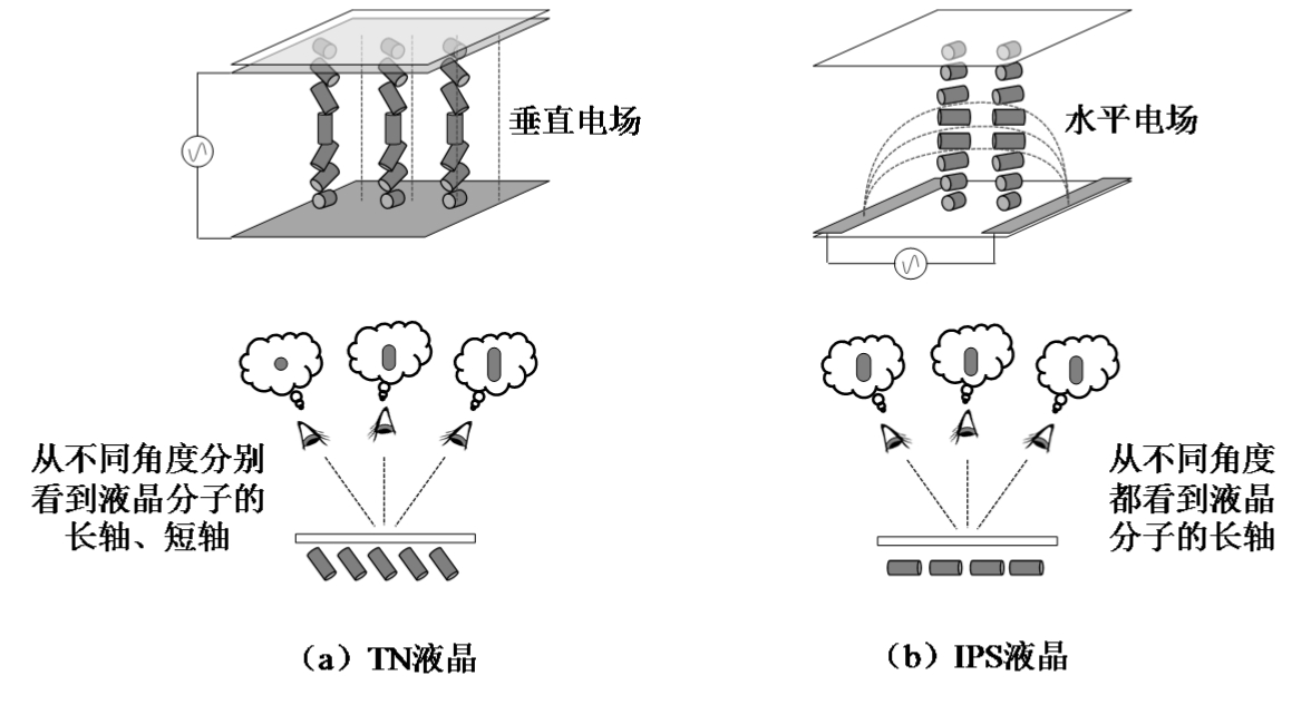 图2-29 从不同角度看到的TN液晶分子和IPS液晶分子的长轴和短轴