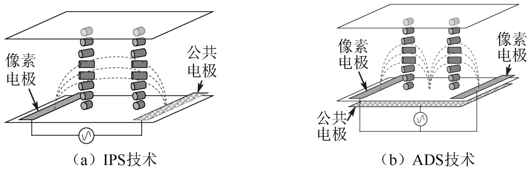 如图2-31(b)所示,在ADS(本质为FFS)技术中,像素电极和公共电极分两层制备,其间用绝缘膜隔开,二者之间的距离非常近。第一层ITO组为公共电极,形状一般为与像素形状一致的正方形,具有较大的面积。在ADS技术中,像素电极与公共电极之间存在较强的平面内电场,因此ADS技术的工作电压可以比IPS技术的更低。