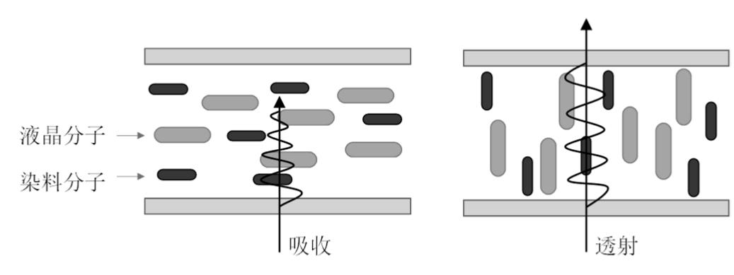 除上述液晶外,还有一类宾主液晶。将少量染料分子溶于液晶中,染料分子与液晶分子同向排列,在电场的作用下随之偏转,称为宾主(Guest-Host)效应,简称GH效应,如图2-35所示。由于染料分子具有二向色性,吸收与分子轴平行的偏振光,因此可以不用或只用一片偏光片。
