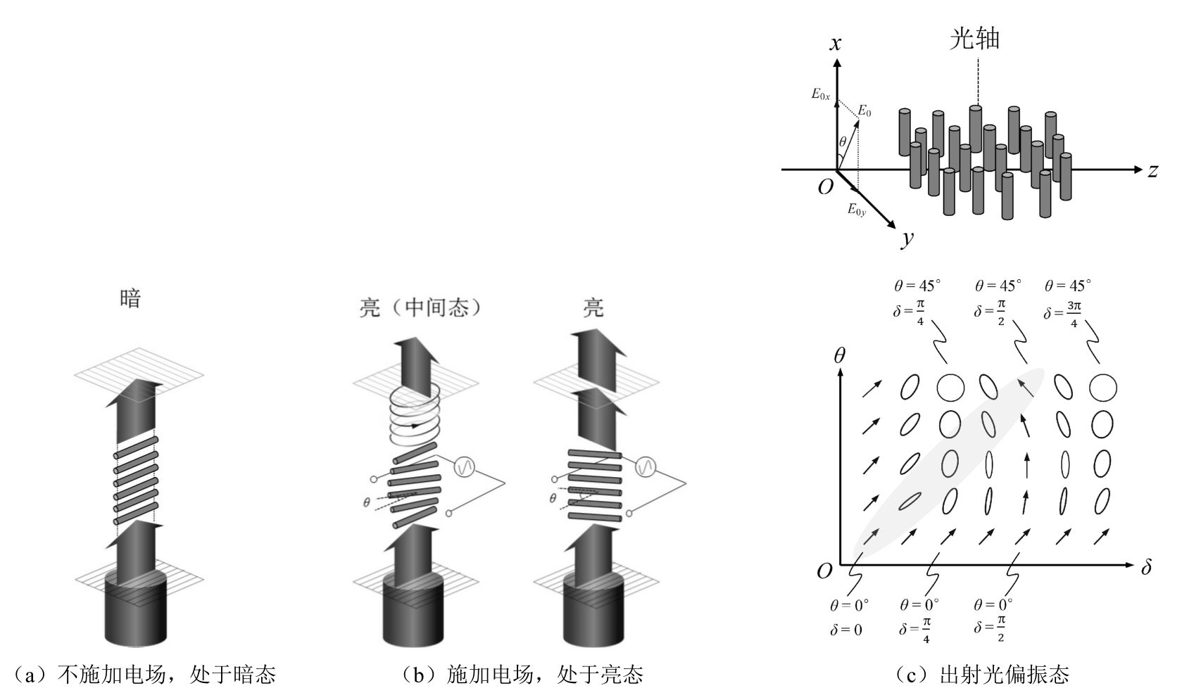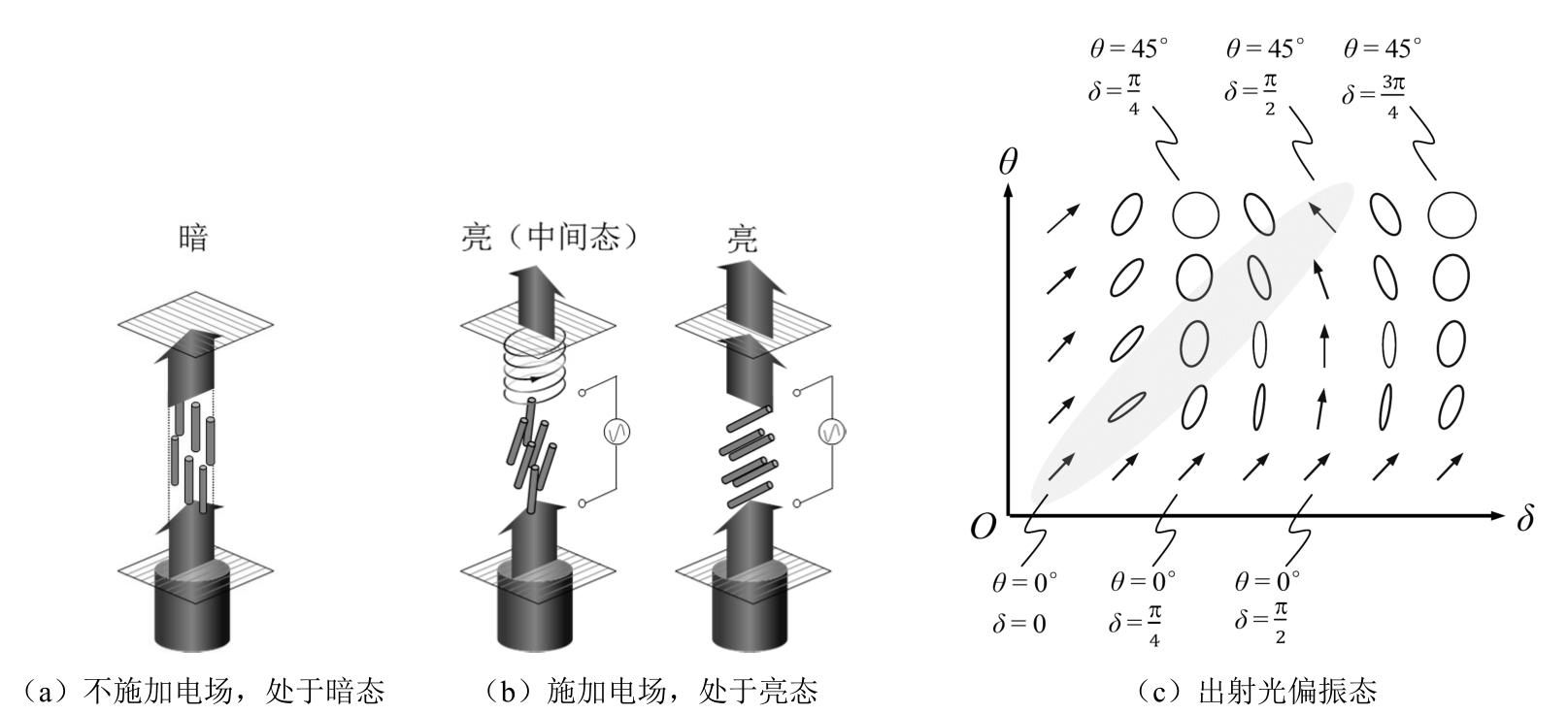 为了增大视角,人们引入了其他类型的液晶,如IPS液晶。IPS液晶是平面转换(In-Plane Switching)液晶,电极的电场平行于液晶平面,能实现广视角。与TN液晶不同,IPS液晶中的液晶分子不是站起来的,而是通过横向电场进行扭转的,不存在液晶分子倾角不对称的问题。它的原理为:①当不施加电场时,液晶分子完全不会旋转,通过上下两片垂直的偏光片滤除光线,显示为暗态,如图2-28(a)所示;②当施加电场后,液晶分子旋转,如图2-28(b)所示, θ (入射光偏振方向与指向矢的初始夹角)及相位差 δ 也随电压逐渐变化,如图2-28(c)所示,在 θ δ 的变化下,偏振态随之变化,出射光的偏振态也在变化,偏振态逐渐变成椭圆偏振,出射光可以部分通过偏光片。偏振态逐渐变成旋转90°后的线偏振,出射光可以完全通过偏光片,显示为亮态。IPS液晶不通电时为常闭状态。