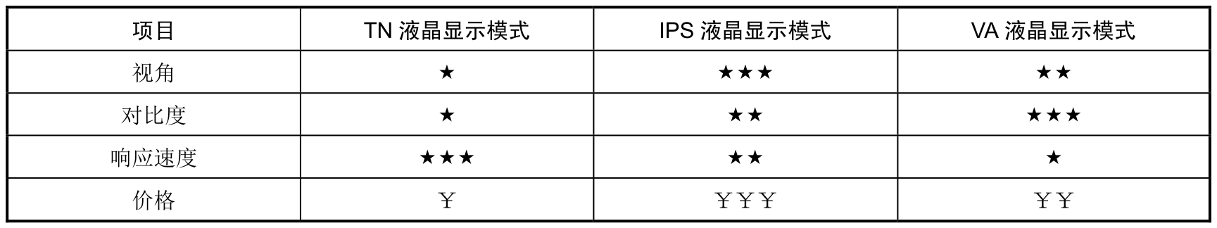 表2-1 IPS液晶显示模式、TN液晶显示模式、VA液晶显示模式对比