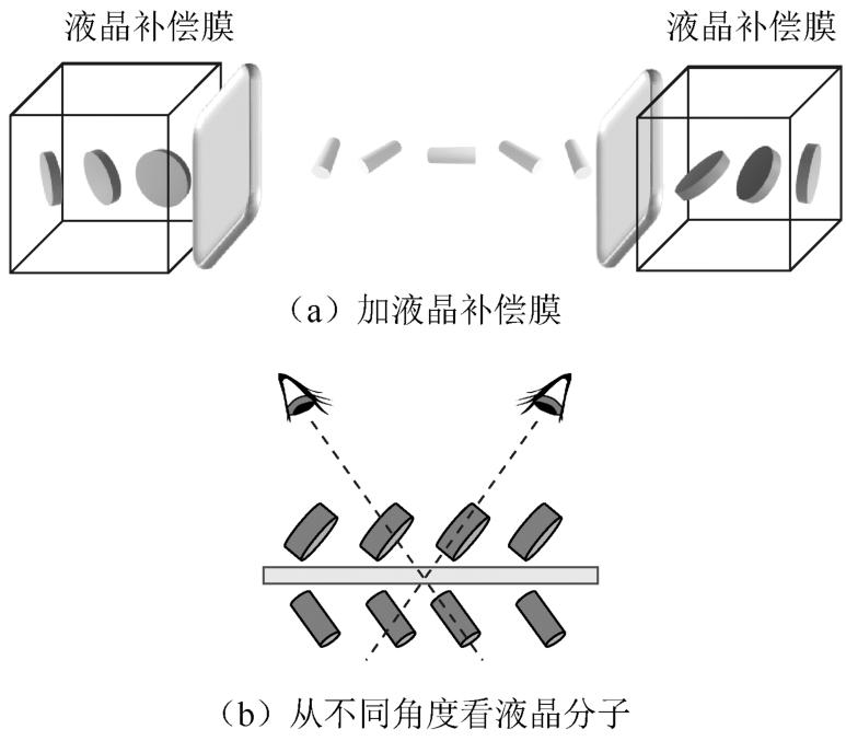 为了解决TN液晶在接近取向层的两端液晶层因锚定力的关系而无法垂直站立的问题,可以按图2-27所示在上下玻璃基板外侧增加碟形液晶补偿膜。由于此部位的漏光程度按梯度变化,因此可以通过改变碟形液晶在厚度方向的倾角来补偿。