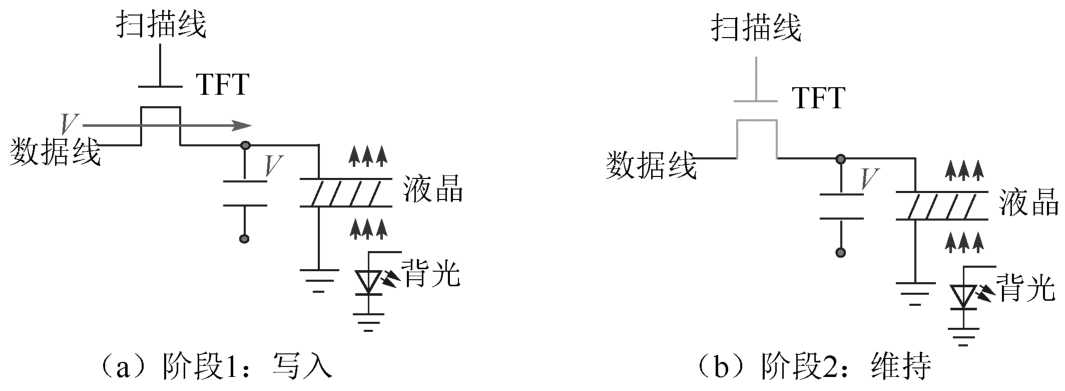 阶段1为写入阶段。扫描线将TFT选通,数据线上的数据电压 V 写入存储电容,这个阶段的时间占一帧的1/ N ,如图2-51(a)所示。
