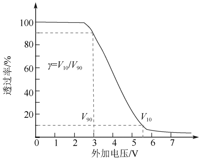 电光响应曲线是透过率和外加电压的关系曲线。对于常白模式的液晶,其透过率随外加电压的升高而逐渐降低,在一定的电压下达到最低点,此后略有变化,具体如图2-37所示。根据电光响应曲线可得出液晶的阈值电压和饱和电压。