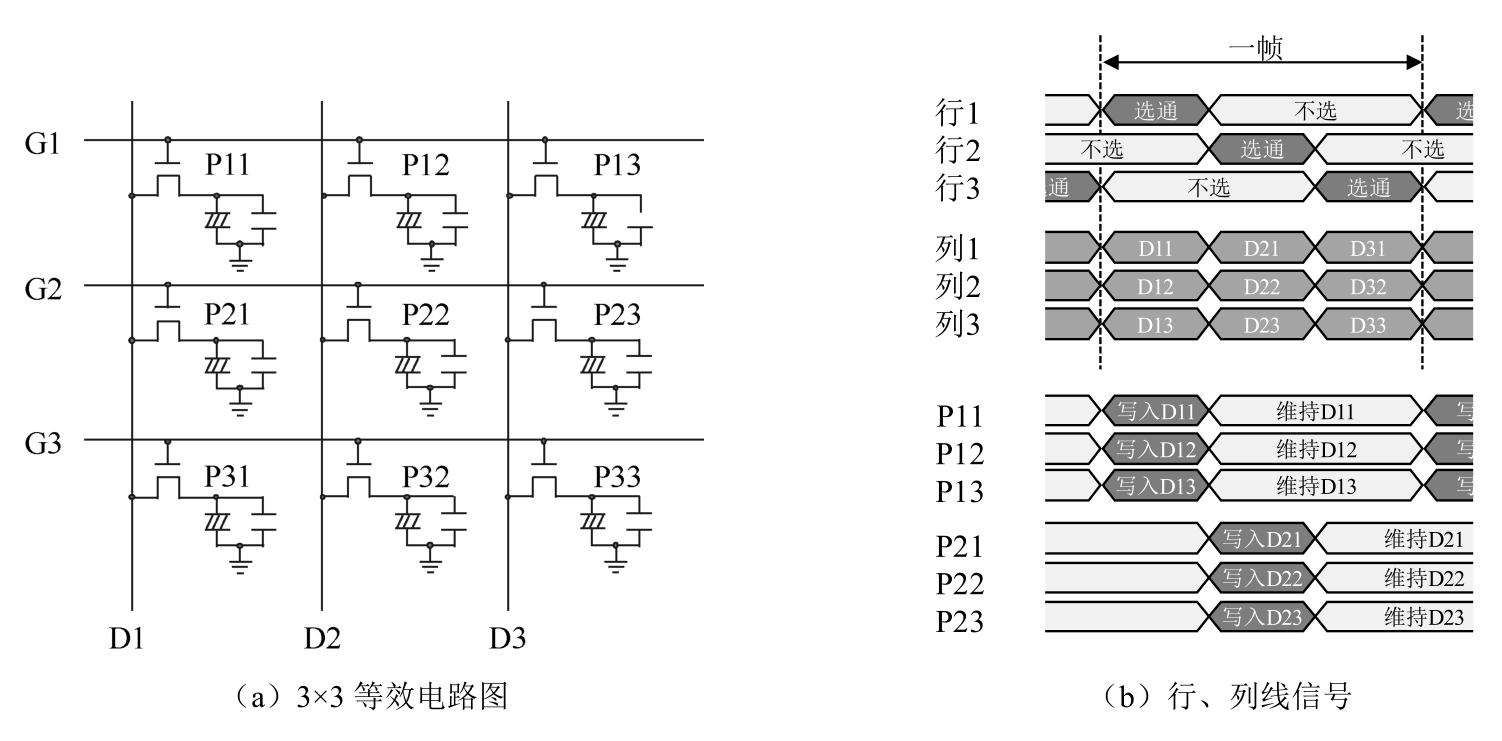 PM驱动又称为无源矩阵驱动,如图2-42(a)所示,将上下基板的条状电极互相正交,交叉点为像素。如图2-42(b)所示,通过行线逐个选通,列线同步施加信号,每行的显示时间占比,也就是占空比=1/行数 N 。行数越多,占空比越小,对比度越低。假设一帧时间为 T ,则单行扫描时间为(1/ N ) T 。