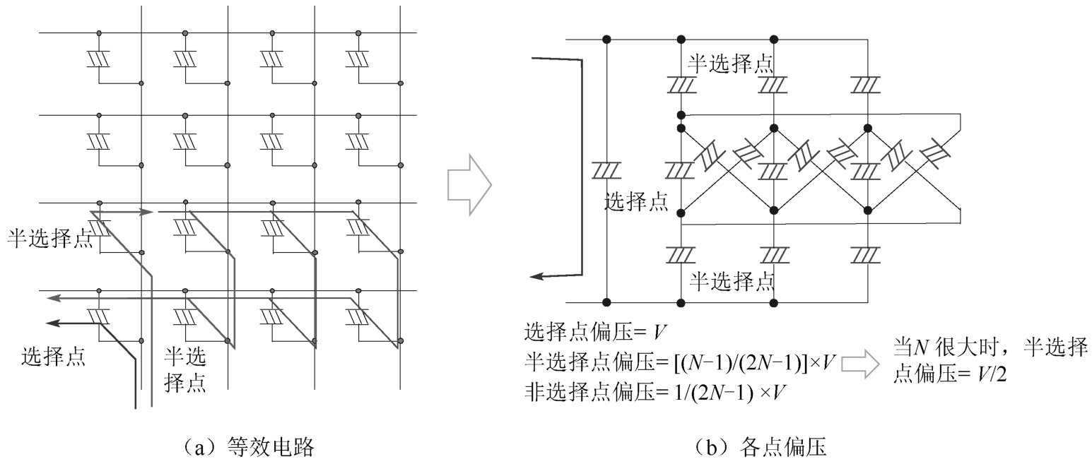 随着行列数的增加,交叉串扰更明显,导致画面不均匀。选择点最邻近的点称为半选择点,假设图2-45中选择点的两端偏压为