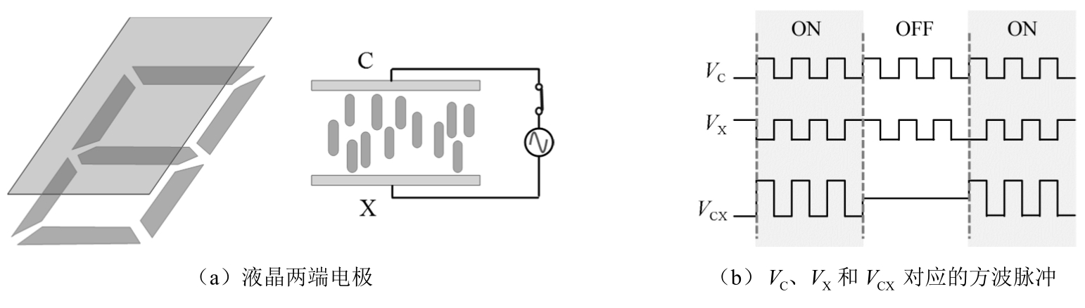 静态驱动的基本原理为:如图2-39(a)所示,每个笔段或像素都有一对电极,包括公共电极C和笔段或像素电极X;如图2-39(b)所示,若公共电极C的电压 V C 和像素电极X的电压 V X 是同极性的方波脉冲,则液晶两端电压差 V CX =0,液晶分子不会翻转;若 V C 和 V X 极性相反,则液晶两端产生电压差,即产生电场。当矩形波的电压比液晶阈值电压高时,液晶分子随电场方向翻转。根据液晶分子的翻转程度,透过率逐渐变化。
