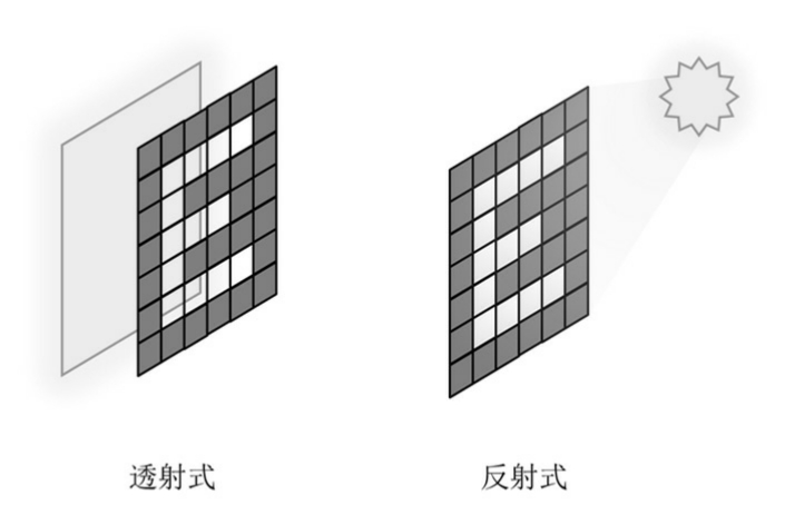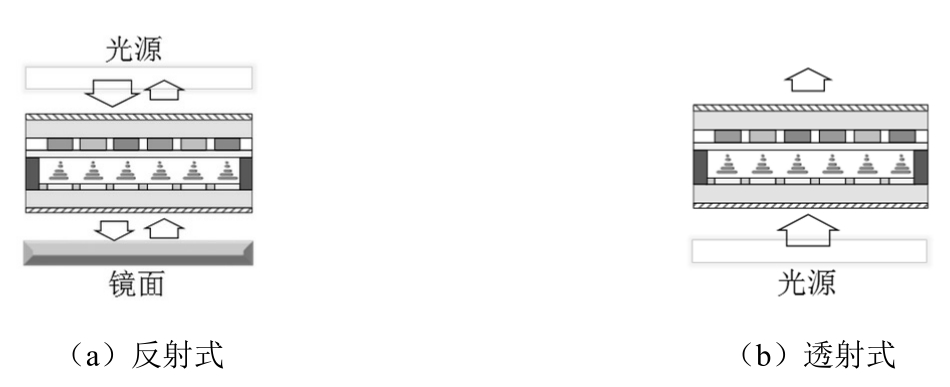 反射式LCD的光源可以是环境光(阳光)或前光灯反射,如图2-58(a)所示;早期的LCD有大量反射式的应用,通过前光灯照射并进行反射,现在的LCD大多是透射式的液晶显示屏,采用透射式的背光源,可以采用荧光灯、白光LED、白光LED+量子点、Mini-LED阵列或Mini-LED阵列+量子点,用于增加在低光源环境中的亮度。透射式是绝大多数液晶显示屏采用的方式,如图2-58(b)所示。
