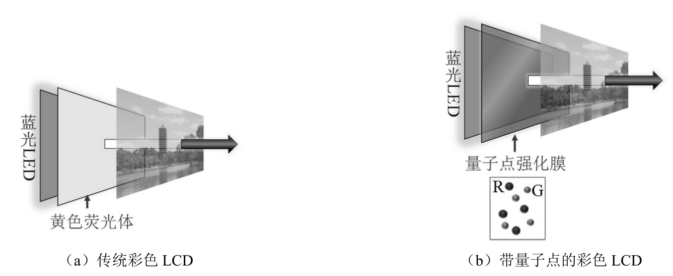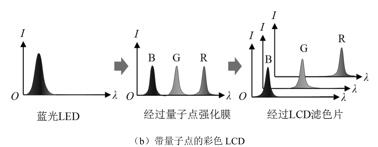 带量子点的彩色LCD如图2-60(b)所示,将黄色荧光体薄膜换成了量子点强化膜,蓝光经过量子点强化膜时,部分蓝光被量子点转换成绿光和红光,如图2-61(b)所示,未被转换的蓝光和量子点发出的绿光、红光一起组成白光,成为液晶显示屏的光源,后续再经过液晶和LCD滤色片,进行发光显示。