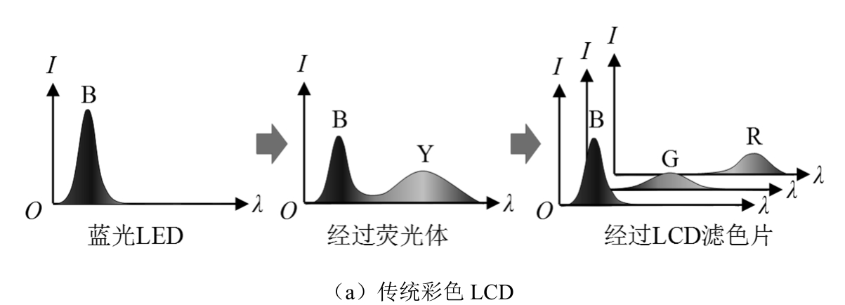 对于传统彩色LCD而言,如图2-60(a)所示,通常是蓝光LED的蓝光透过黄色荧光体薄膜后,光谱发生展宽,部分蓝光被转换成黄光,未被转换的蓝光和转化后的黄光共同组成白光背光源,如图2-61(a)所示。液晶起着像素透光开关的作用,决定着不同像素和滤色后RGB三色光的强弱,经过RGB三色滤色片后,输出的红色和绿色的光谱较宽。