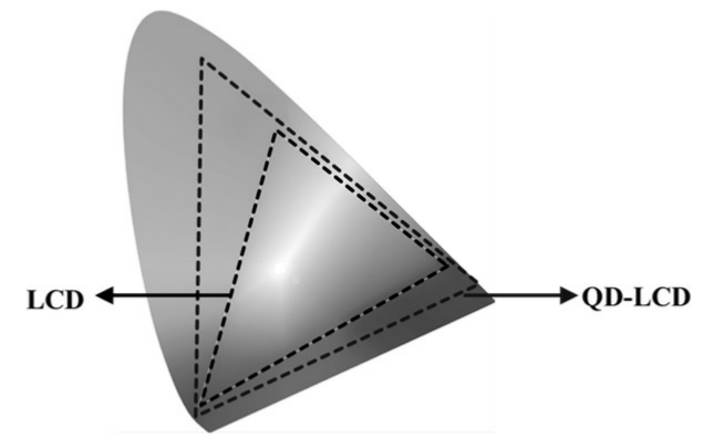量子点(Quantum Dot,QD)技术可以改善背光的光谱。主流的LCD背光是蓝光LED的蓝光经过黄色荧光体转化后混合实现白光的,白光的光谱不够纯粹。现在很多液晶显示屏添加了量子点强化膜使白光光谱中的红绿蓝三个尖峰更明显,实现更广的色域,使得颜色更加丰富。