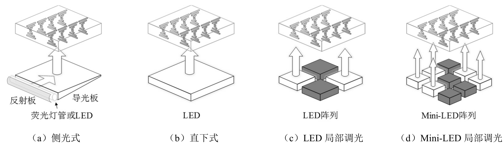 近年来,LCD的背光技术也在不断发展,4种LCD背光源结构如图2-59所示。早期的LCD背光源大多是侧光式(Edge Light)的,在液晶显示屏BLM的四边、两边或一边排上背光源,通过导光板等结构,让光均匀伸展。之后发展出了直下式(Direct Light),白光LED作为背光排成行列。近些年发展出了LED局部调光(Local-Dimming)及Mini-LED局部调光,保留了LED的特性,LED做得更小更密集,且每个单元可以单独控制明暗。LED局部调光技术可以做出几十个分区,根据显示画面的局部明暗来开关不同分区。Mini-LED局部调光技术的背光分区数更多,可达几百个甚至数千个,同样根据显示画面的局部明暗来开关分区,以实现更高的对比度,但成本也更高。相关内容将在第7章详细讨论。