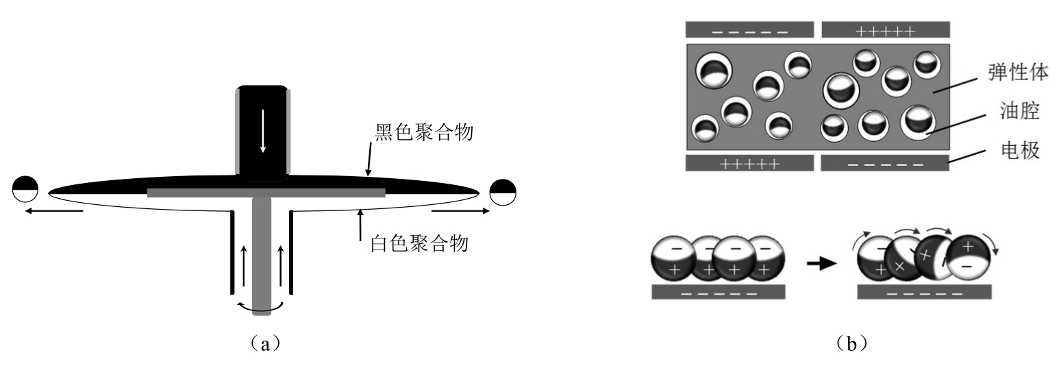 如图3-5(a)所示,在转盘的两个对立面上分别放置黑色和白色聚合物,当转盘旋转时,在转盘的边缘就会形成长长的带状流体和一些小的喷气涡状的流体,喷气涡状的流体会由于瑞利不稳定性发生破裂,从而快速固化形成双色小球,即反转球。根据聚合物的性质,小球的两个半球分别形成永久正/负电偶极子,随后小球与未固化的弹性体混合,固化成为250~500μm厚的膜材,并将膜材浸泡在低黏度的硅油中,使其膨胀,使得每个球的周围形成油腔,于是每个小球可以在各自的油腔内自由旋转,如图3-5(b)所示。通过调控电场来驱动反转球转动,实现黑/白的显示。考虑小球的重力等要素,调整硅油的密度等参数,可以使反转球在去掉电压后,能保持长时间的稳定,图像得以持续保持。每次电压转换,调整一次反转球的状态,即视为一次数据擦写,在一般情况下,反转球能擦写数千次。