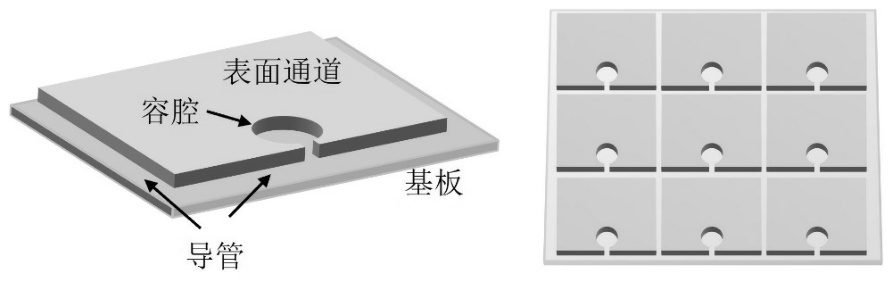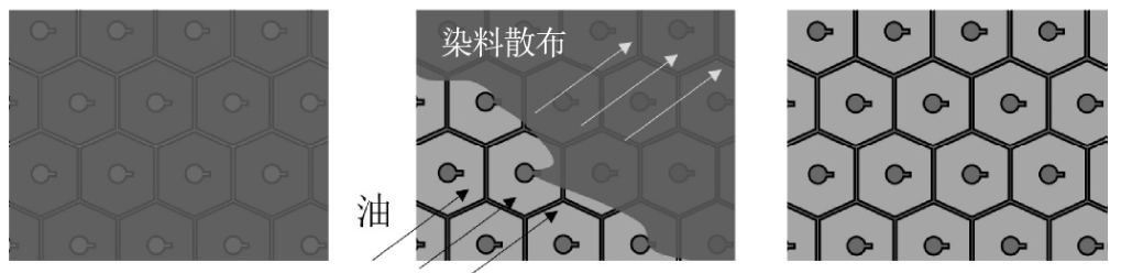 如图3-29所示,在结构制作完毕后,首先注入彩色染料,染料分散体充满容腔和表面沟道,然后在器件的一侧注入油(十二烷),油由于低表面张力在表面流通,同时将彩色染料从器件另一侧挤出;当油到达容腔时,由于表面沟道的高度远远小于容腔的深度,油只会在容腔周围移动,而将染料分散体留在容腔内,最后对整体器件使用紫外线环氧树脂进行封装。