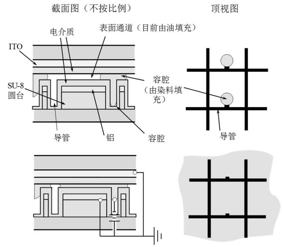 电流体显示的基本结构如图3-27所示,首先,每个像素中都存在一个微小容腔,将水性染料分散体放置在一个微小容腔内,容腔占可见像素的区域小于10%,染料基本都隐藏在视野之外;其次,在每个像素上方有表面通道,面积占据整个像素面积的90%以上,用来容纳显色时溢出的染料;最后,整个像素由导管环绕用来提供染料回流到容腔内的通路。该结构的显色面积得到了提高,可以极大地解决电润湿色彩差异受限的问题。
