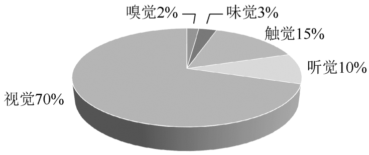 信息泛指社会传播的各种内容,包括知识、数据等。现在我们所处的时代是人类信息爆炸的时代。截至2017年,人类拥有的信息总量每12小时翻一倍。人类如何获取如此庞大的信息呢?信息的获取主要通过5种感知途径,包括视觉、听觉、嗅觉、味觉、触觉。如图1-1所示,视觉是人类最主要的信息获取方式。通过视觉途径获取信息,成了人机交互中关键的一环。