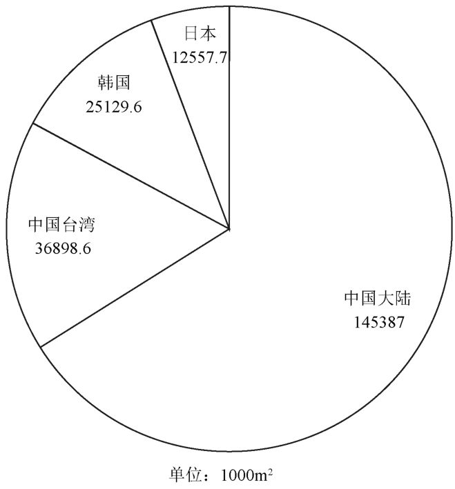 从地域上分析数据,图1-15是2022年全球面板各地出货量统计扇形图,以面板总面积计,单位是1000m 2 ,中国大陆2022年贡献了约1.45亿m 2 ,也就是145km 2 。注意这里的统计不用显示屏的数量来统计,而要通过面积来统计,比如同样从流水线出来的1.3m×1.5m的玻璃,如果切成计算机显示器大小的屏幕,能切出十多块屏幕,而如果切成手机屏大小的屏幕,能切出50~60块屏幕,所以,用面积来衡量是相对科学的方式。中国大陆2022年贡献的面板面积约为145km 2 。如果以人均的面积来算,除以80亿人口,每人可以拿到0.018m 2 ,大概是一块手机屏幕大小,所以2022年一年中国生产的屏幕量足以给全世界每人提供一块手机屏幕。这只是中国显示产业一年的出货量,由图1-19看出,中国的面板出货量明显处于一个世界领先的地位,不算中国台湾地区,已经占了2/3的比例。