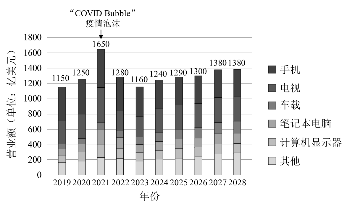 图1-14 全球显示行业的市场营业额(数据来源:DSCC,2024—2028年为预测)
