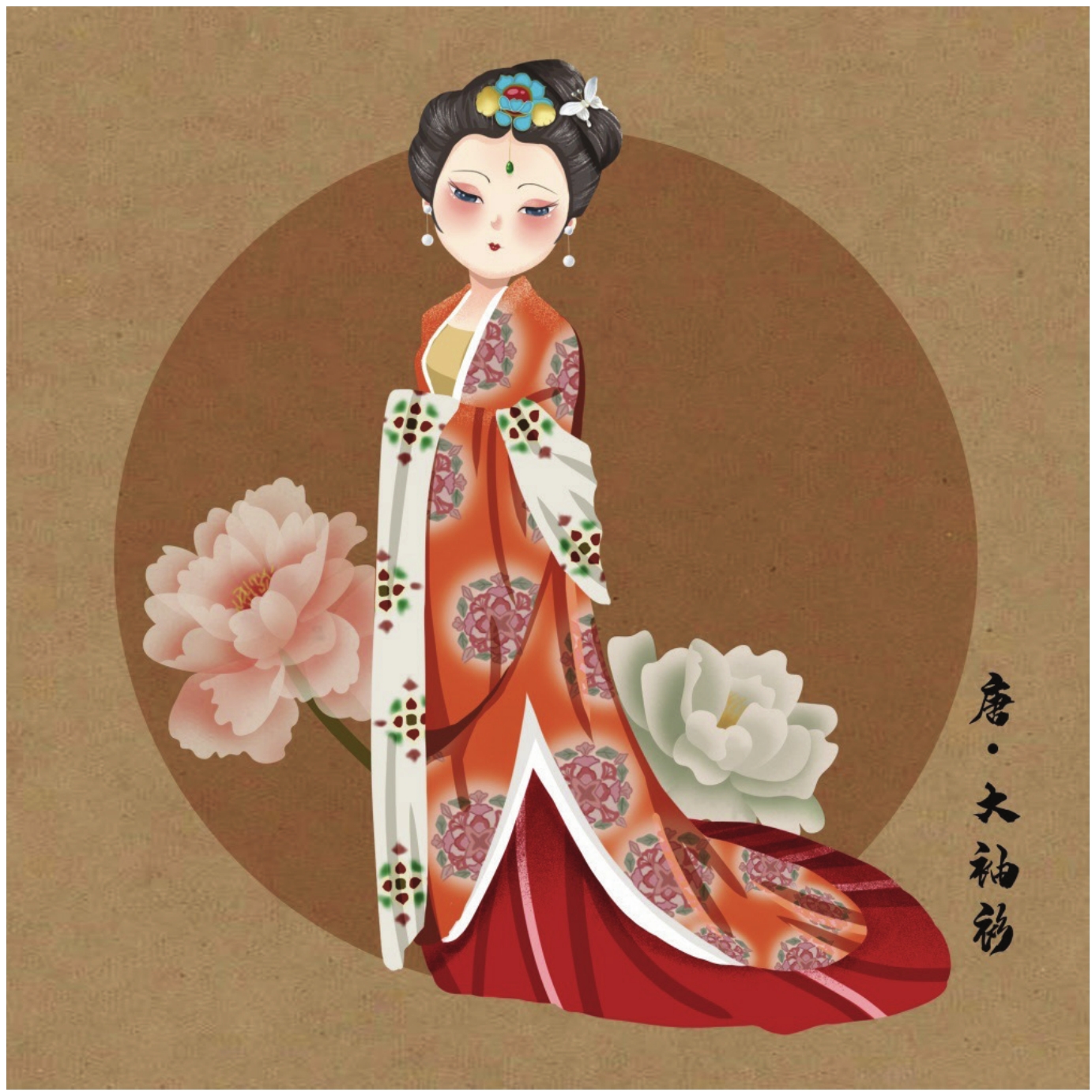 初唐装束多见于隋代,上穿小袖短襦,下身着紧身衣裙,披帛,裙腰束至腋下,中间绸带系扎,胡服之后襦裙仍是妇女的主要装束。盛唐以前胡服流行;盛唐之后大袖衫襦;中晚唐袖宽达到顶点。史料记载,统治者下诏规定当时衣袖不得超过一尺五寸,而民众多有不从的记载,可见当时喜好宽袖的风尚之盛。