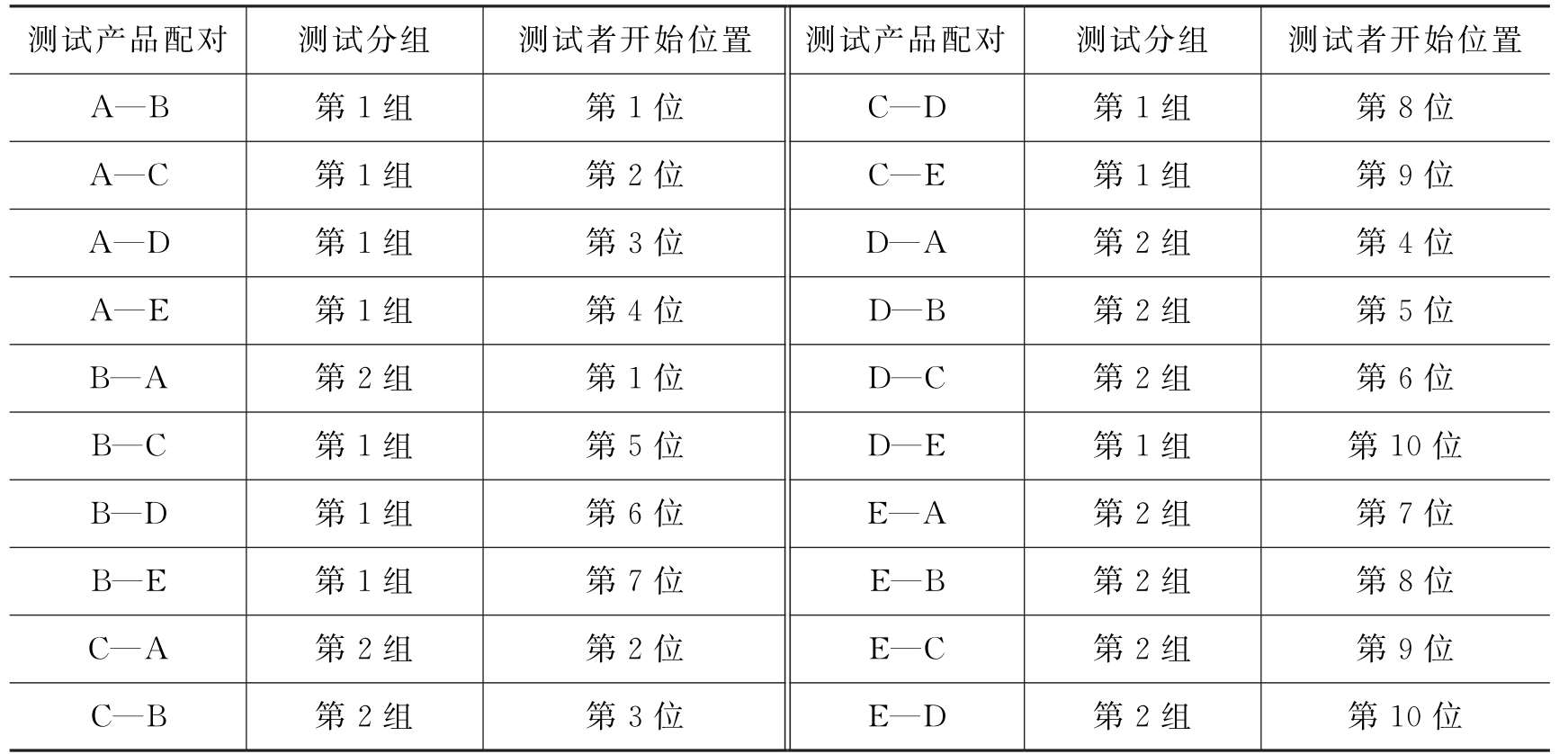 。配对分组如表3-3所示。除此之外,为了消除测试中第一组配对一直处于第一次测试的位置而形成系统误差,还需要将配对后的测试次序进行轮换,即第一位测试者从第一组配对开始(A—B),第二位测试者从第二组配对开始(A—C),依此类推。这样每一组配对都可以得到相等的开始机会,测试者人数为P