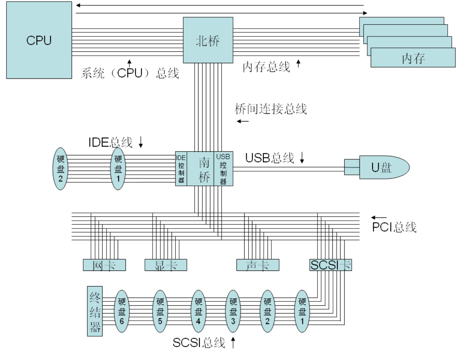 通过图2-2可以体会到,计算机的主板上的各个部件本身就形成了一个网络,而且通过网卡,还可以连接到外部网络。
