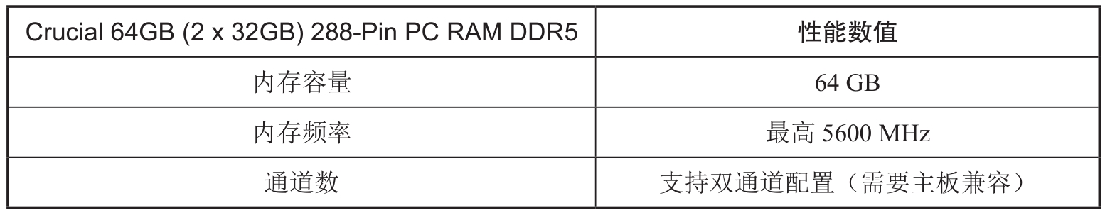 在购买内存时,商家有时还会特意标注DDR4、DDR5等内存规格。DDR4、DDR5描述了内存的技术标准、芯片组织结构以及控制算法等诸多细节。相较于DDR4,DDR5主要的性能提升在内存容量和带宽方面,在选购时我们需要关注主板的内存插槽是否支持相应规格的内存。作为例子,表2-1给出一个商用内存的参数和规格。