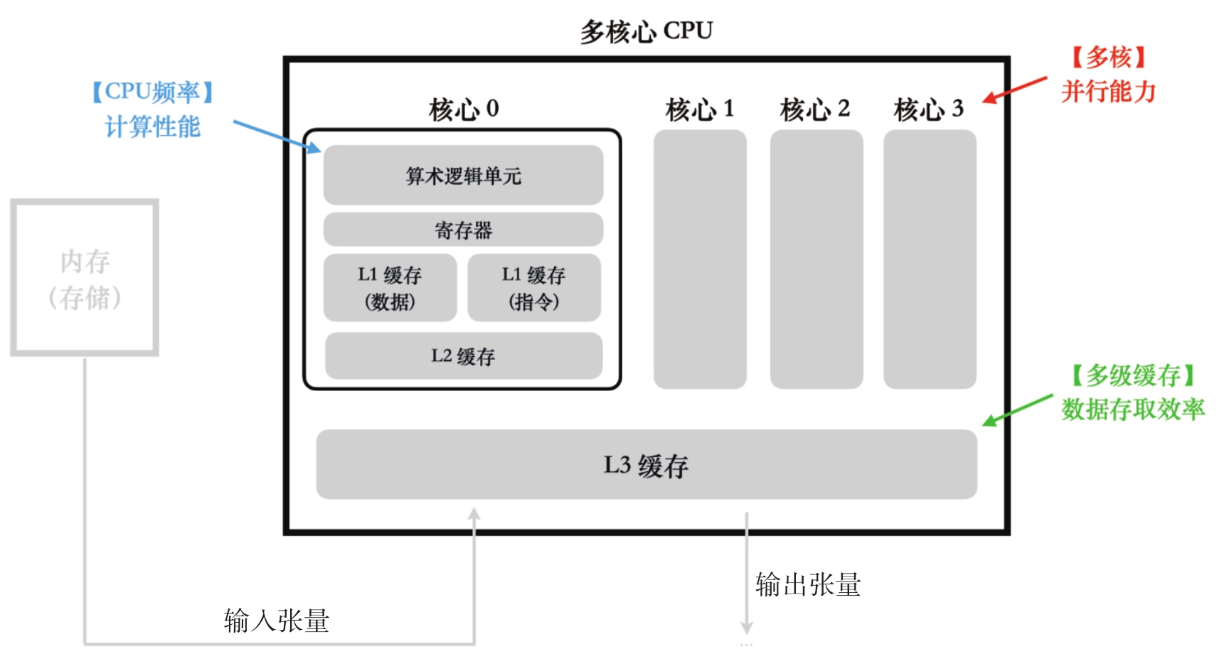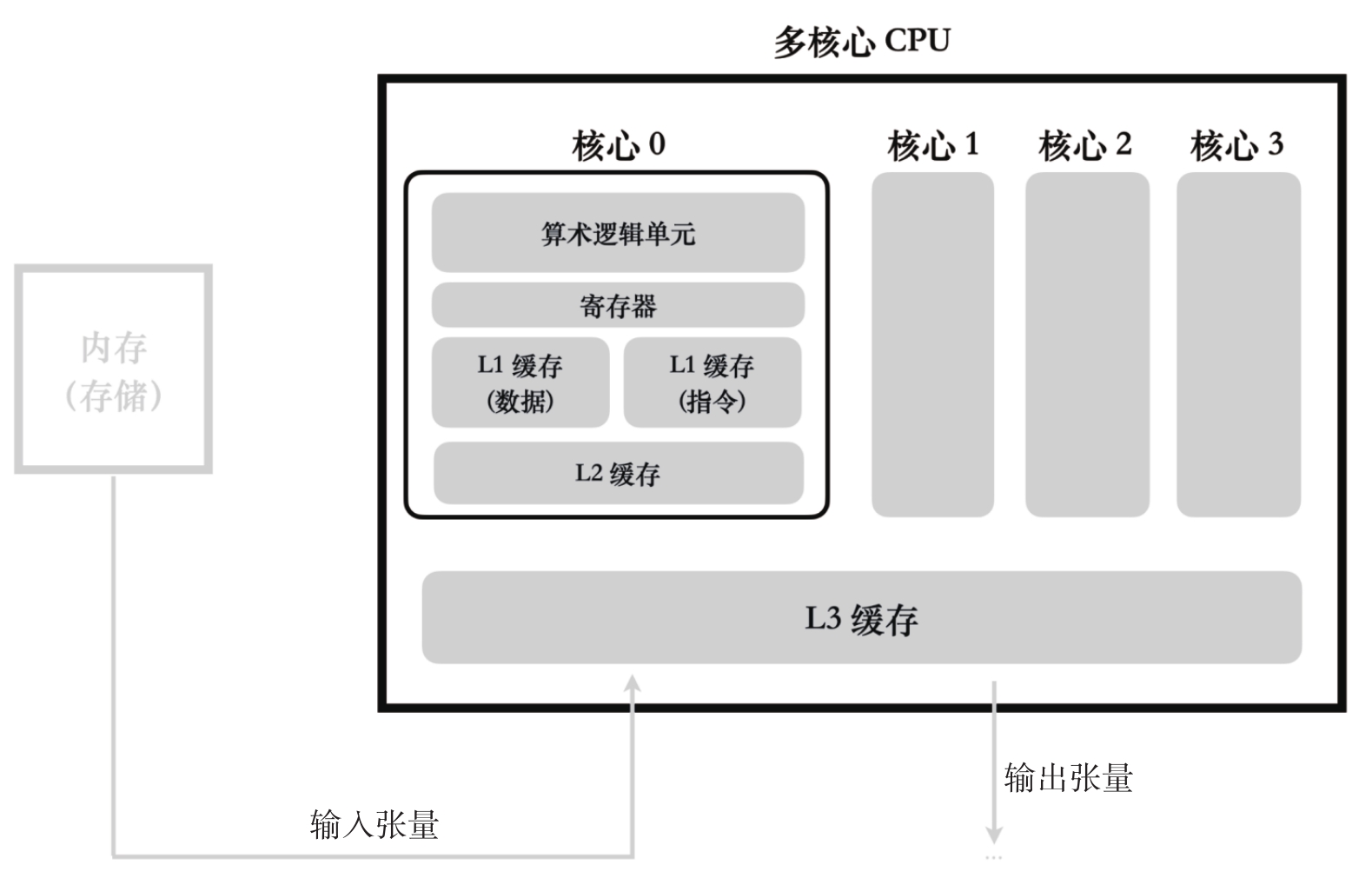 综上所述,对于深度学习而言,CPU的核心结构包括负责计算 的算数逻辑单元 (ALU)、负责加速数据读写速度的 多级缓存 ,在此基础上还会采用 CPU多核心设计 来增加并行度。在图2-3中将这些细节补充进去,如图2-4所示。