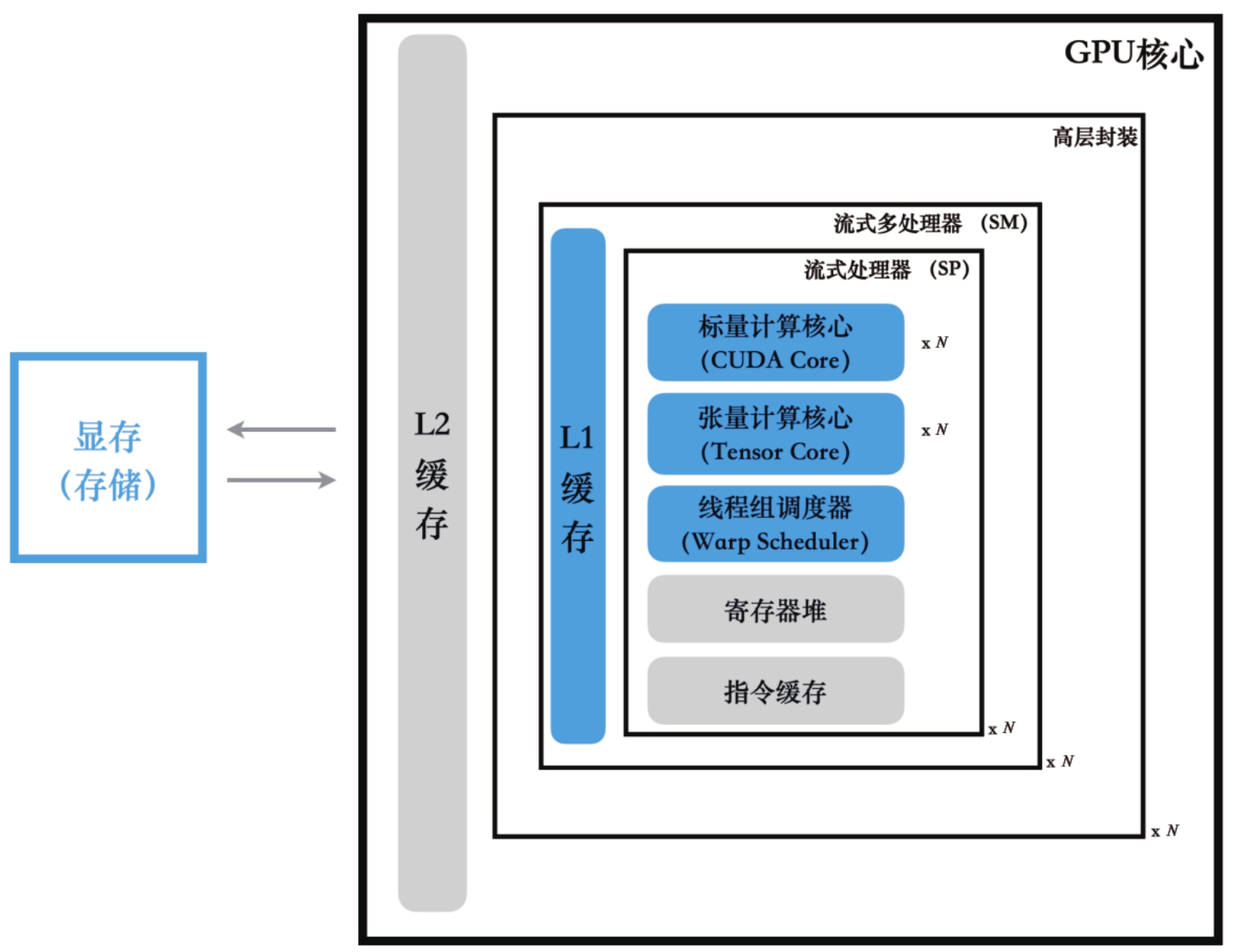 张量计算核心、标量计算核心决定了GPU的整体计算效率;L1缓存、显存决定了GPU存取数据的效率;