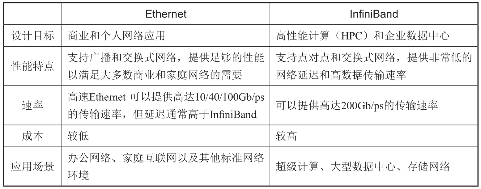 在涉及多机多卡的分布式训练中,不同机器上的GPU通信的硬件不再是NVLink或者PCIe这种高带宽低延迟的互联,而是基于网络设备的传输。两类主流的解决方案分别基于Ethernet以及InfiniBand,详情见表2-6。