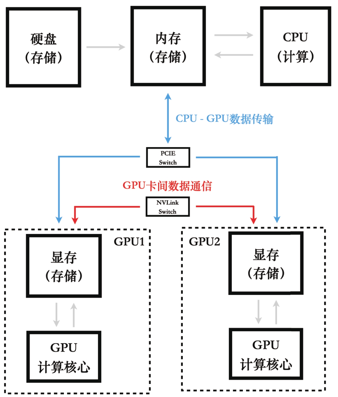 到此为止,一个单卡模型训练的硬件框架已经搭建完毕了。然而如果想要进一步扩大数据规模、增加模型参数,那么还需要搭建起分布式训练系统才能有足够的显存和算力支持起大模型的训练。