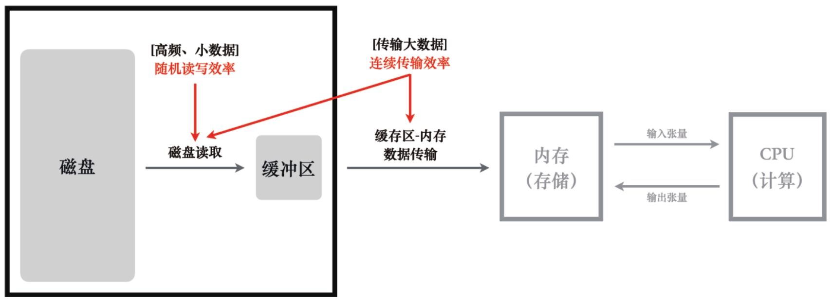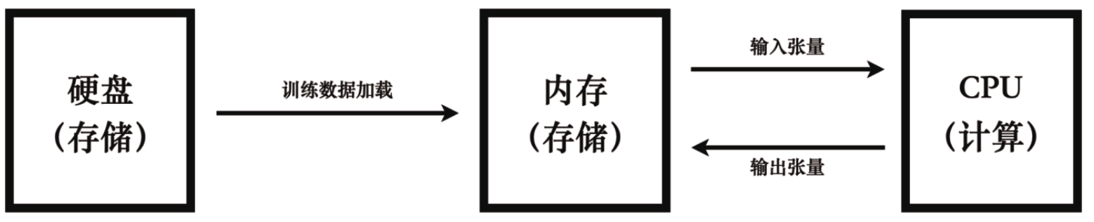 那么内存中的数据是从哪里来的呢?一般来说数据是存储在硬盘上,在训练的过程中从硬盘动态地读取到内存中,然后送入计算芯片参与相应的运算。这一过程如图2-5所示。
