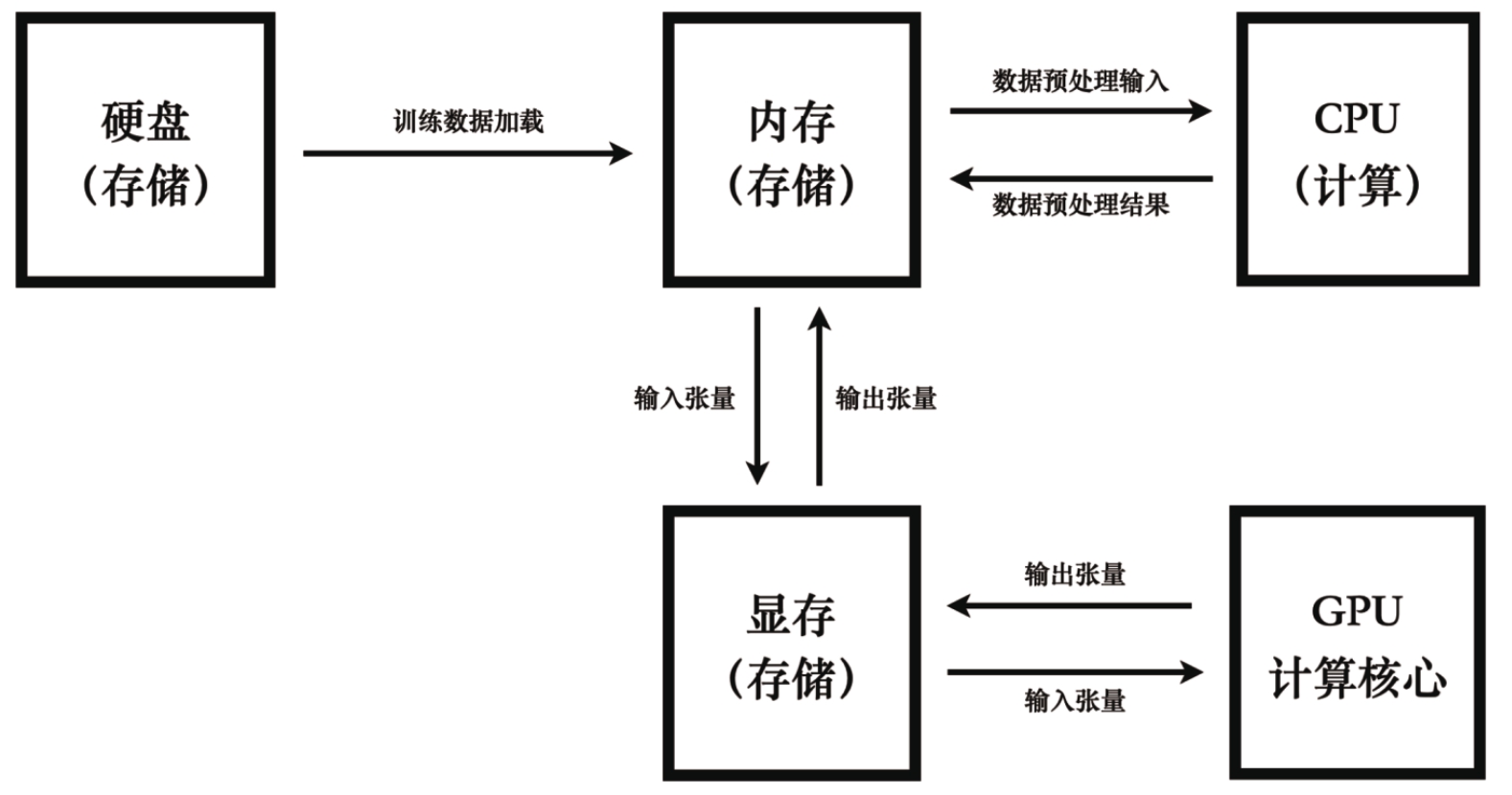 这也解释了为什么模型训练任务尤其青睐GPU,因为GPU不仅擅长数值计算,其芯片设计上还专门为并行计算进行了特化。在训练系统中加入GPU之后,我们将原先放在CPU上的算子计算移到GPU上面。但是GPU的计算核心并不能直接从内存读取数据,于是在二者之间又加入了 显存(VRAM) 这个额外的存储元件。 GPU计算核心与显存的关系可以简单理解为CPU核心与内存之间的关系 。当需要在GPU上进行计算时,先要将张量数据从内存读取到显存,随后从显存读取数据到计算核心完成运算,而计算结果写回内存则会经历完全相反的过程。此时大部分的计算任务都放在了GPU上面,因此CPU主要承担相对轻量的数据预处理以及一些调度任务。在图2-5的基础上加入GPU后,硬件结构如图2-7所示。
