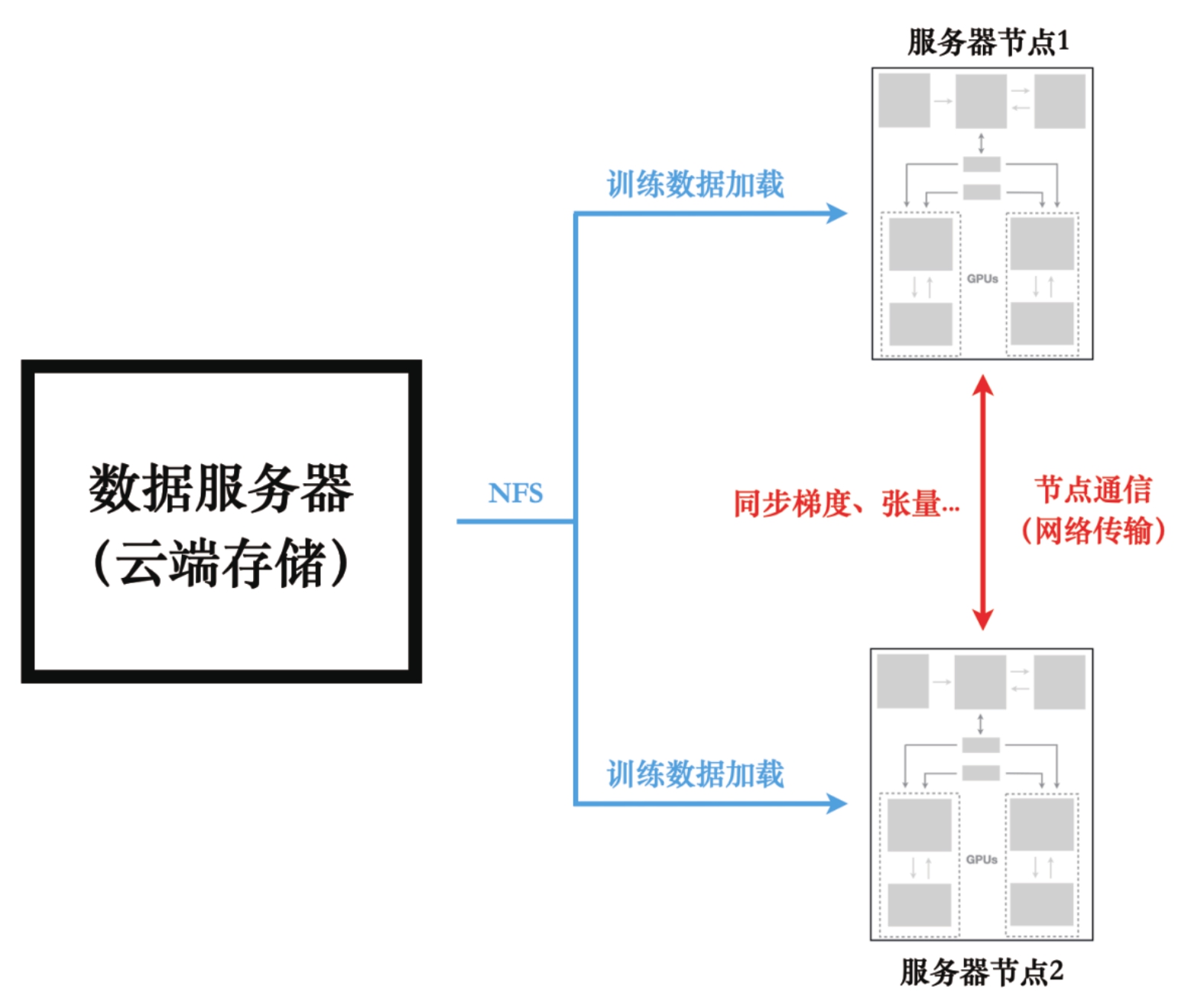 对于分布式训练系统来说,通过每台服务器的本地硬盘存储大规模训练数据并不现实。一方面本地硬盘的容量有限,难以承担规模高达上百TB的文本、图片、视频和3D素材等数据。其次大模型的训练可能需要成百上千台机器协作完成,所有机器都需要能够访问到相同的数据集。如果使用本地硬盘进行存储,我们还需要将数据复制到每台机器的本地存储中,需要的存储容量和数据传输时间是难以承受的。