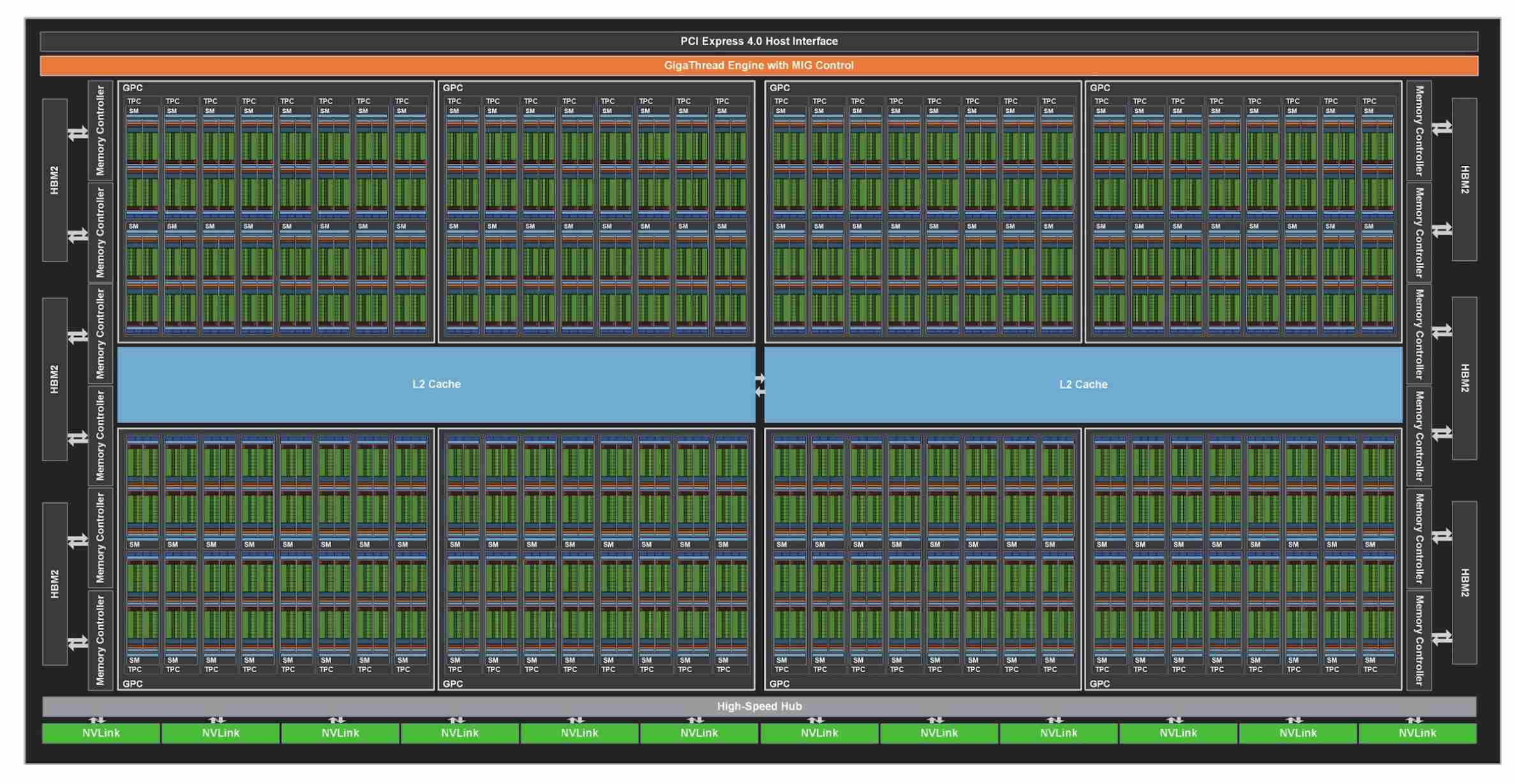 线程束调度器则与CUDA编程模型中的线程束(warp)概念直接对应,负责线程间的通信和调度。除此以外,还有一些诸如显存控制器、纹理缓存等细节没有画在图里,完整的A100结构可以从NVIDIA文档
