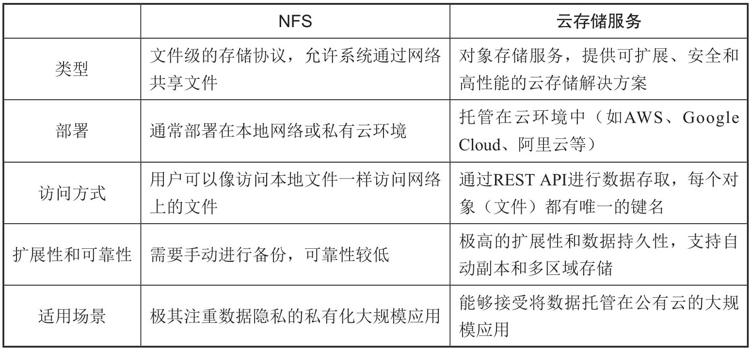 因此基于网络的存储方案在分布式系统中更受欢迎。通常也分为两类,即NFS(network file system,网络文件系统)和基于云服务的存储方案。这两种方案的区别和适用场景对比如表2-7所示。