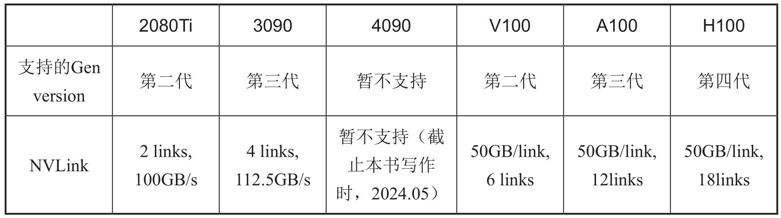 NVLink第一代在Pascal架构的P100 GPU引入,当时仅支持GPU和GPU间的传输,随后NVLink的每一代性能都随着GPU架构的升级而有所提升。这在需要高速通信的分布式深度学习训练任务中对于性能的提升是非常明显的。NVIDIA不同产品线常用GPU的NVLink相关参数,如表2-5所示。