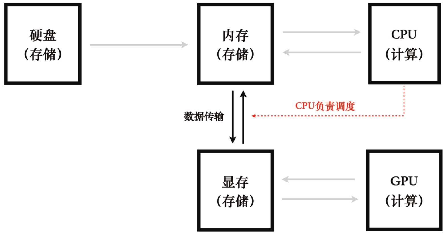 图2-7 显存、GPU、硬盘、内存、CPU硬件示意图