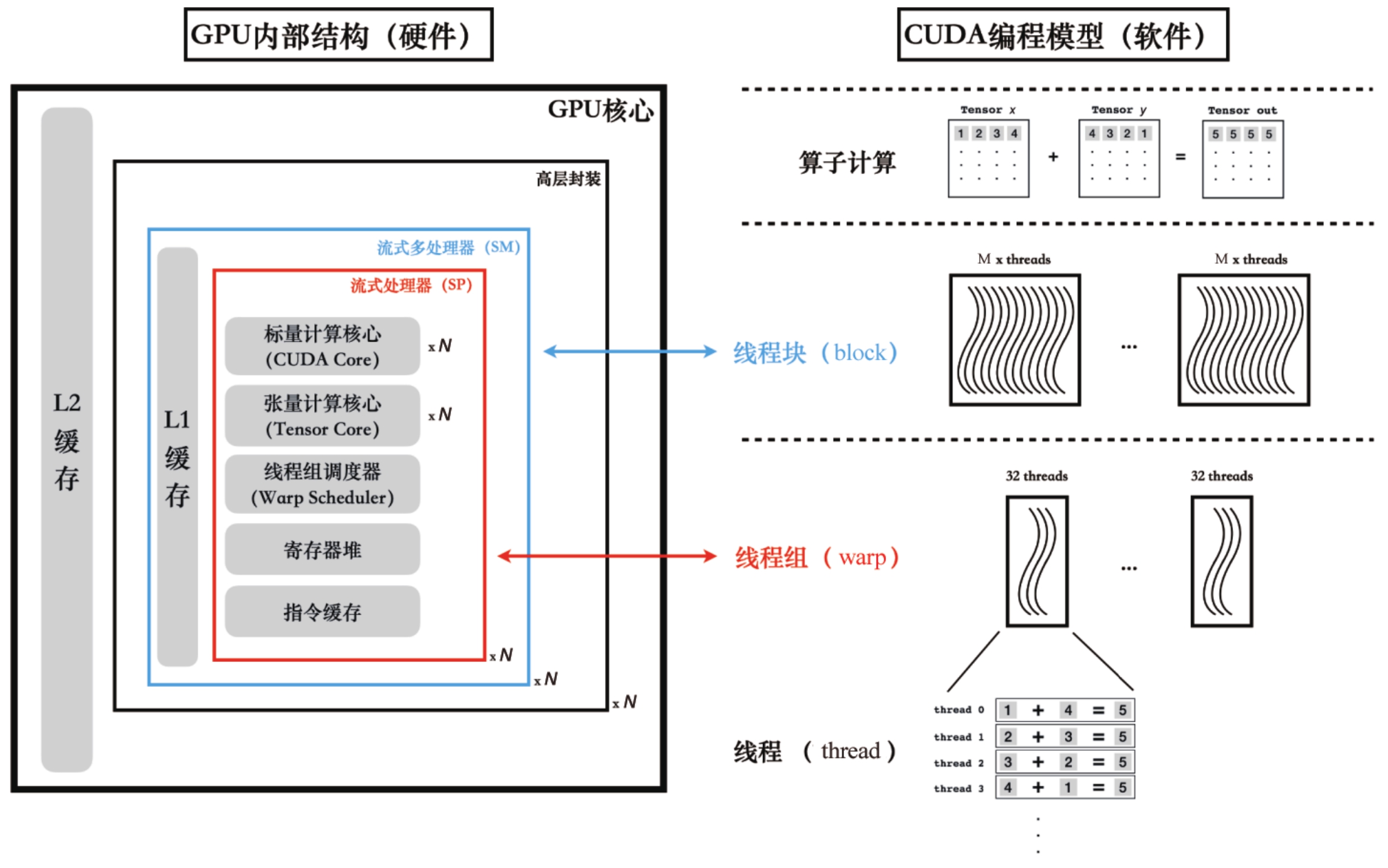 可以看出,GPU的并行能力其实分为软件并行和硬件并行两层。软件层面的并行主要由程序员在大脑里完成——利用数学知识将算子拆分成若干独立运行的软件线程,然后使用CUDA语言来实现。硬件并行则体现在对这些软件线程的并行调度上,可以说是对软件并行的具体实现。其实现方法是对软件线程进行分组,然后以线程束(warp)或者线程块(block)为单元,并行执行这些软件线程。