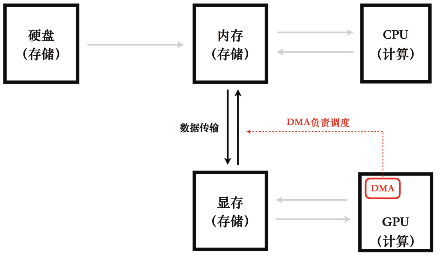 除了从内存中读取数据以外,NVIDIA还提供了GPU Direct Storage技术,允许借助DMA Engine直接从硬盘读取数据到显存。对于多节点分布式训练系统,NVIDIA还提供了RDMA技术,同样借助DMA Engine,可以直接从网络接口将数据传输到显存中。然而这些技术的使用频率相对较低,且多见于分布式训练系统。对于大部分读者来说, 内存和显存之间的传输数据是更为常见的场景。