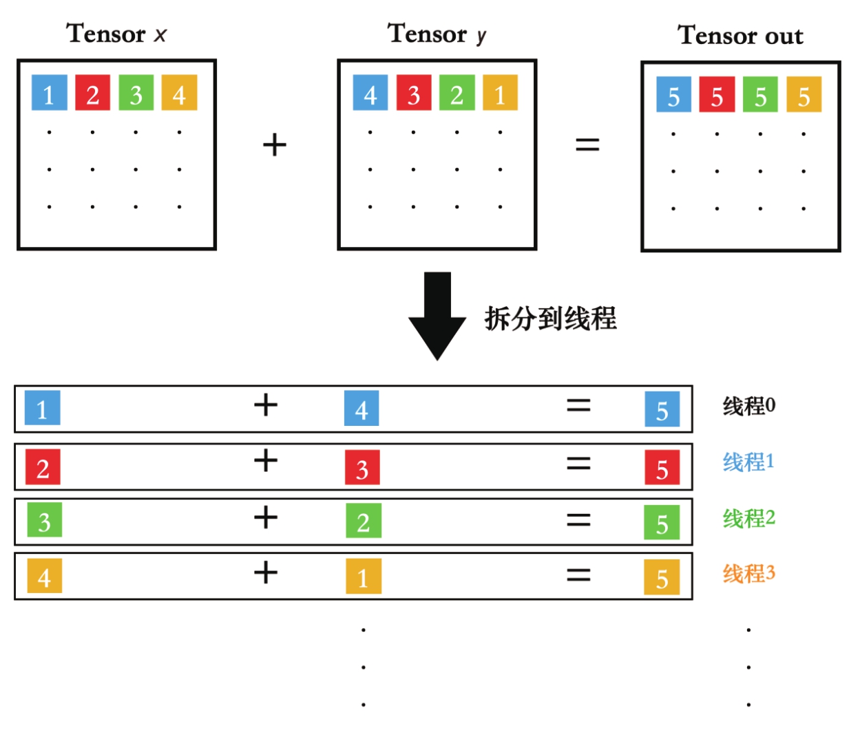 CUDA编程模型本质是对GPU硬件的抽象,而考虑到GPU近乎套娃一般的硬件架构,CUDA语言的复杂程度就可想而知了。抛开大部分高级用法和优化技巧, CUDA编程模型的核心是要求程序员将算法的实现代码,拆分成多个可以独立执行的软件任务。 比如对于张量加法算子而言,我们可以将其拆分成每个元素的点对点加法,如图2-10所示。