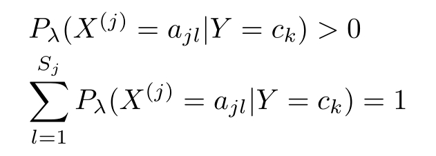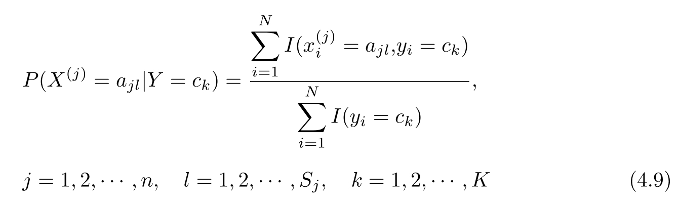 设第 j 个特征 x ( j ) 可能取值的集合为{ a j 1 , a j 2 ,…, a jSj },条件概率 P ( X ( j ) = a jl | Y = c k )的极大似然估计是