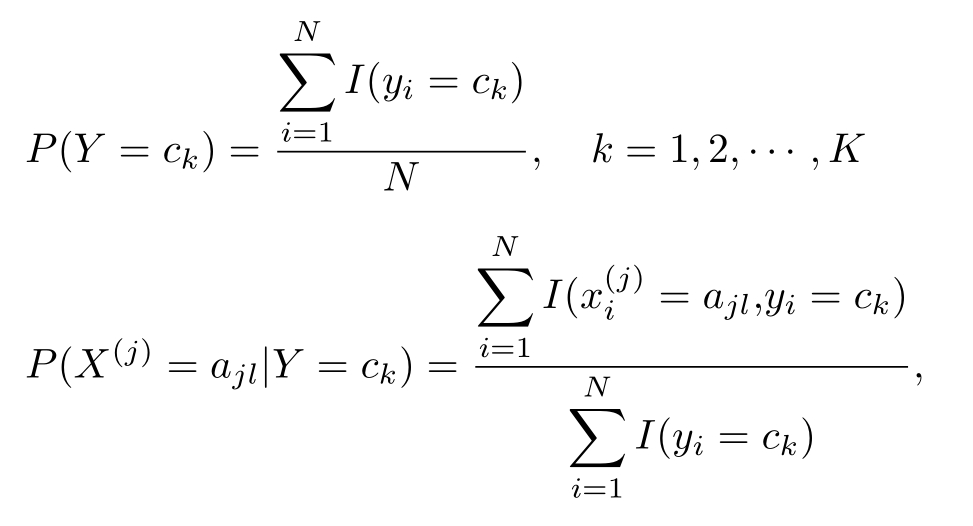 在朴素贝叶斯法中,学习意味着估计 P ( Y = c k )和 P ( X ( j ) = x ( j ) | Y = c k )。可以应用极大似然估计法估计相应的概率。先验概率 P ( Y = c k )的极大似然估计是