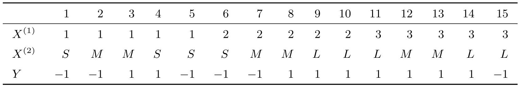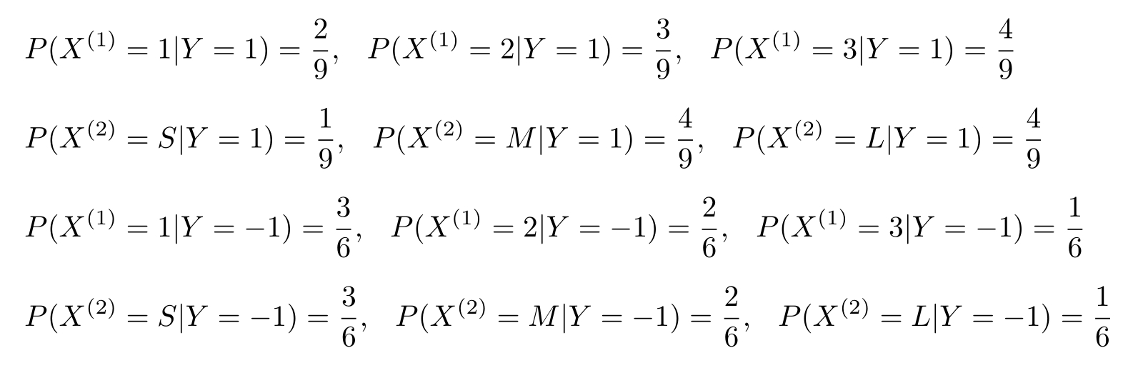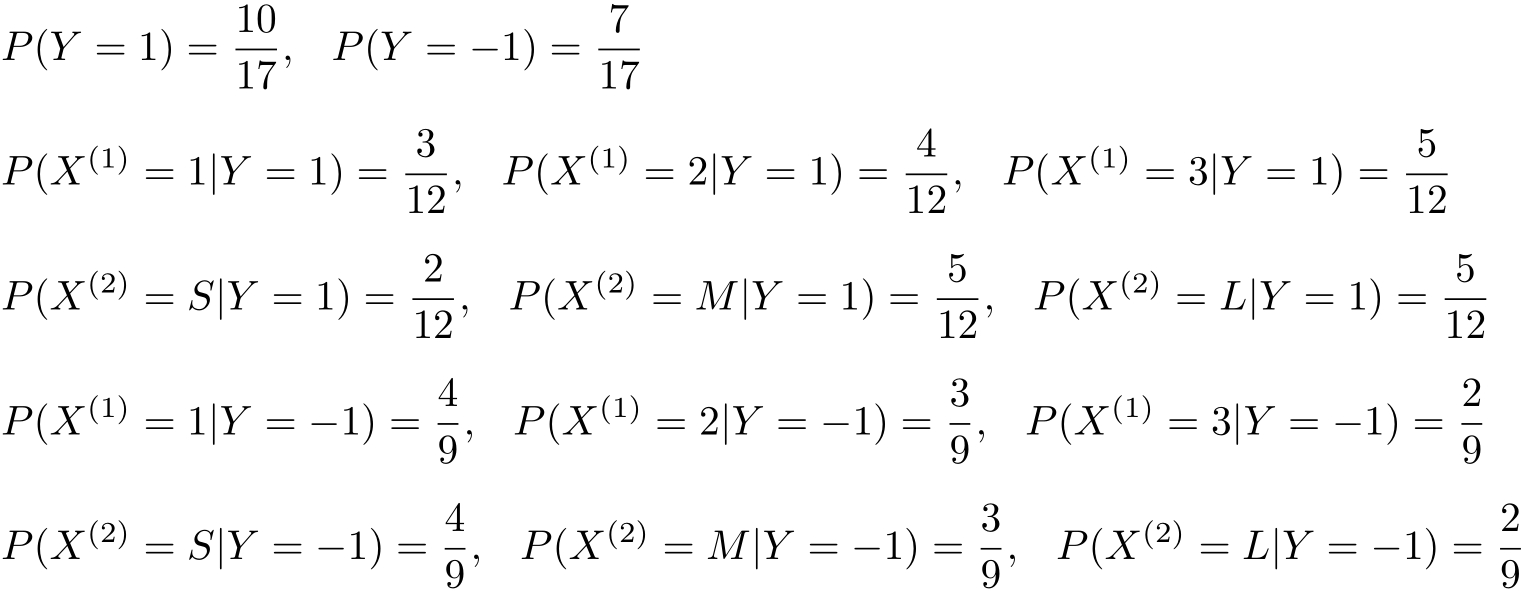 例4.1 试由表4.1的训练数据学习一个朴素贝叶斯分类器并确定 x =(2, S ) T 的类标记 y 。表中 X (1) , X (2) 为特征,取值的集合分别为 A 1 ={1,2,3}, A 2 ={ S,M,L }, Y 为类标记, Y ∈ C ={1,−1}。