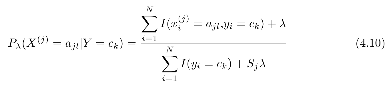 式中 λ ≥0,等价于在随机变量各个取值的频数上赋予一个正数 λ >0。当 λ =0时就是极大似然估计。常取 λ =1,这时称为拉普拉斯平滑(Laplacian smoothing)。显然,对任何 l =1,2,…, S j , k =1,2,…, K ,有