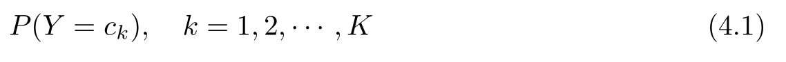 设输入空间 X ⊆ R n 为 n 维向量的集合,输出空间为类标记集合 Y ={ c 1 , c 2 ,…, c K }。输入为特征向量 x ∈ X ,输出为类标记(class label) y ∈ Y 。 X 是定义在输入空间 X 上的随机向量, Y 是定义在输出空间 Y 上的随机变量。 P ( X,Y )是 X 和 Y 的联合概率分布。训练数据集