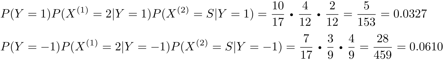 由于 P ( Y =−1) P ( X (1) =2| Y =−1) P ( X (2) = S|Y =−1)最大,所以 y =−1。