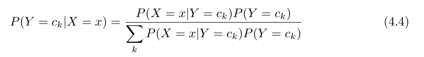 朴素贝叶斯法分类时,对给定的输入 x ,通过学习到的模型计算后验概率分布 P ( Y = c k | X = x ),将后验概率最大的类作为 x 的类输出。后验概率计算根据贝叶斯定理进行: