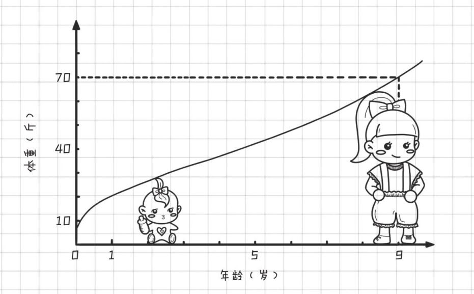 看见我摇头,妈妈开始了思考。“我想想看怎么讲哈。”妈妈继续又画了一个图,“这样看哈,这条横线表示年龄,这条竖线表示体重,这两条线放在一起就是一个直角坐标系。我们把这两条线都画上格子,就跟尺子一样,年龄这里一格表示1岁,体重这里一格表示10斤(1斤=0.5千克)。你今年9岁,我们在9这里画一条虚线上去,你今天去打羽毛球的时候称的体重是70斤,我们在70这里画一条虚线过来,这个交叉点表示你9岁时候的体重。你刚出生的时候是6斤,我们在0岁和大约6斤这里画一个点。我们把这两个点连起来,是不是就是一条你从出生到现在体重随着年龄增长的曲线了?”